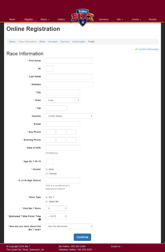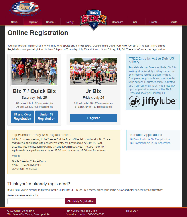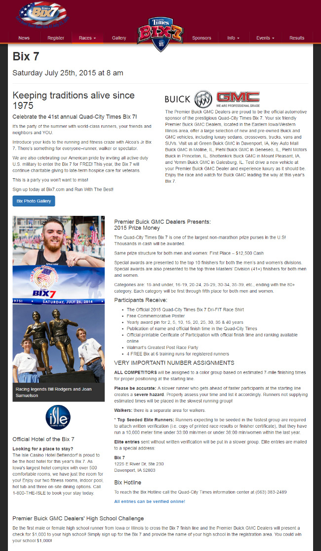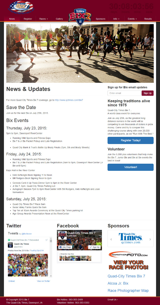 Responsive website redesign for the Bix 7 race. While working at the Quad-City Times, I was given the opportunity to give the Bix 7 website a redesign. The site uses the bootstrap framework and runs on PHP and MySQL. Users can register online using a custom built multi-page registration form. It also features an admin system that employees can use to enter mailed entries into the database. The front-page features a custom countdown clock design element that includes days, hours, minutes, and seconds until the race kicks off.
