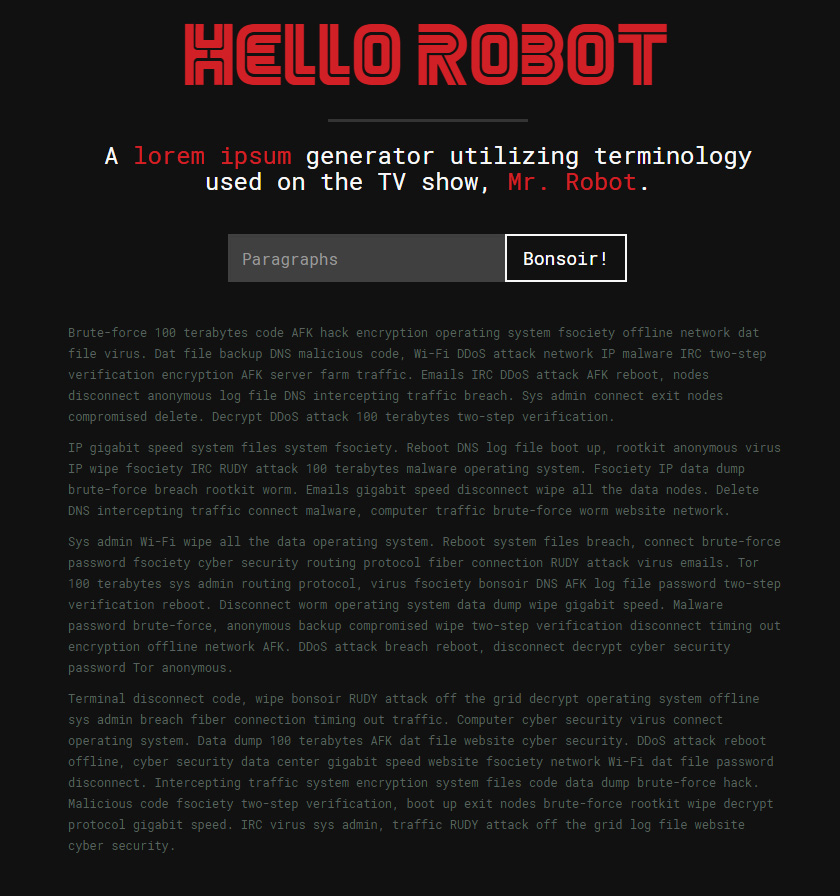 A lorem ipsum generator generator utilizing terminology used on the TV show, Mr. Robot. This was just a fun project I did to familiarize myself with object oriented PHP.
