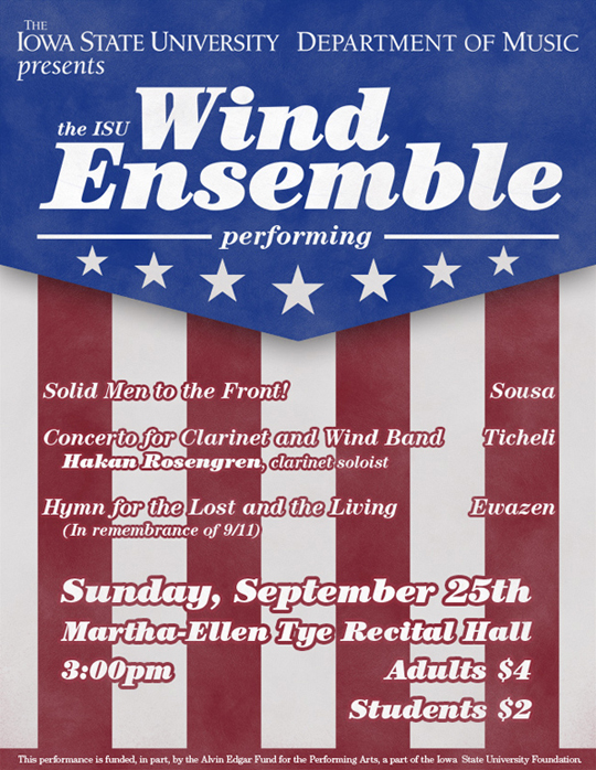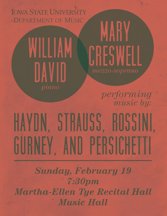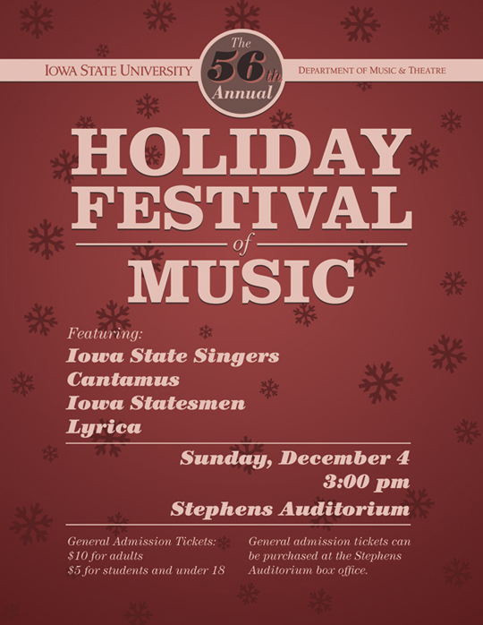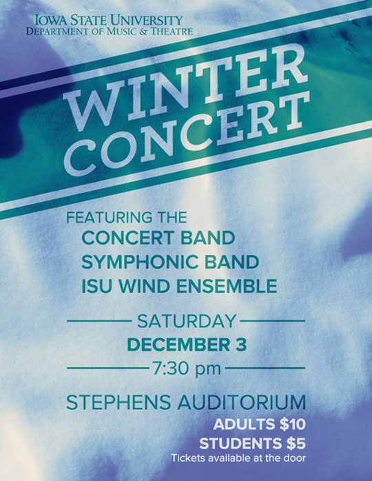 A variety of posters I designed for the Department of Music at Iowa State University. The posters were made to advertise concerts that the Dept. of Music was hosting or sponsoring.
